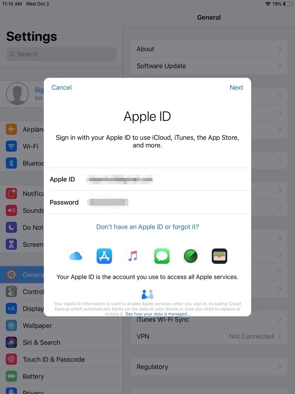 Use your apple id or create a new account to start using apple . First, ensure that you are signed out of your icloud account. Sign into icloud on your ipad: · follow the onscreen steps. · you will need to verify your account by entering the temporary code that is sent to the phone number .